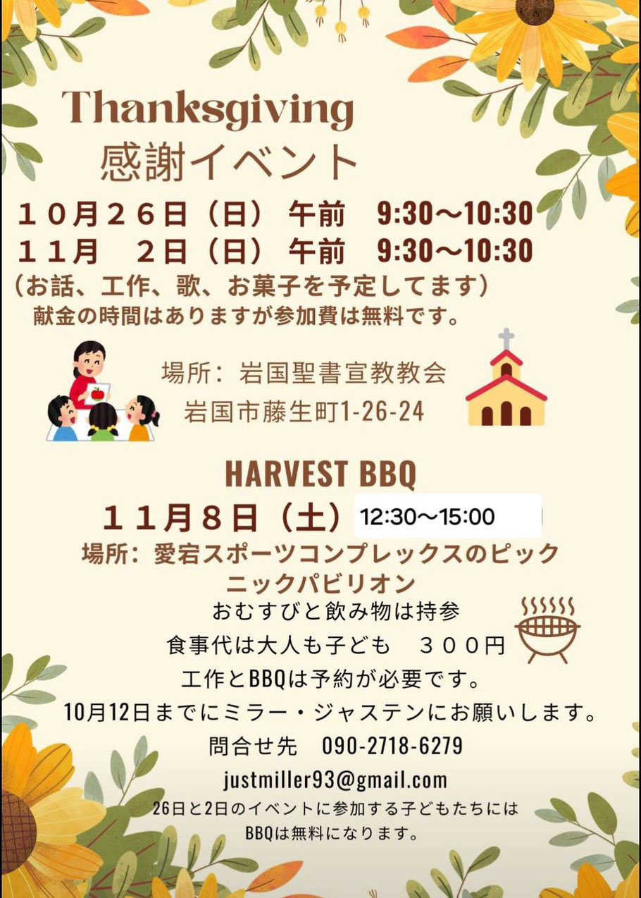今年2025年は 大人も子供も楽しめるパーティーを企画しています10月26日・11月2日は教会で子供たちメインの教会内での工作などを作ったり歌を歌ったり・お話を聞いたりの感謝祭